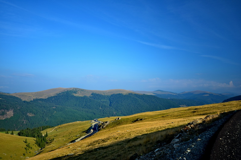 Besonders eindrucksvoll ist die Transalpina in den Zonen über der Baumgrenze: das schwarze Band der recht neuen Teerstraße (ohne Leitplanke!) windet sich über die gold-gelben Grashänge. Die Steigung ist teiweise knackig, ich muss doch an der einen oder anderen Stelle pausieren, um wieder zu Atem zu kommen. Die Pausen nutze ich, um die schöne Lanschaft auf mich wirken zu lassen. Es sind hier nicht die schroffen Felslandschaften wie in den Alpen, sonder eher sanft geschwungene Hügel, die weit weniger steil aussehen, als sie dann tatsächlich sind...