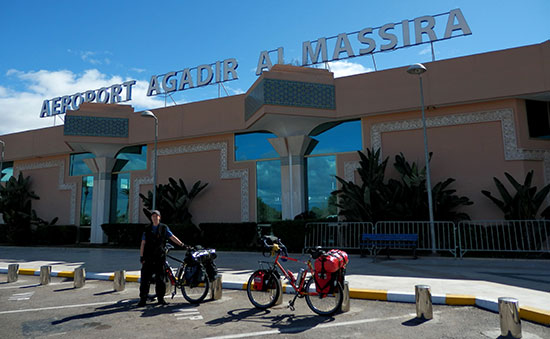 Ankunft in Agadir (Flughafen) am 19.2. mit Condor gegen Mittag. Unkomplizierte Fahrradmitnahme; vorher beim Buchen der Tickets im Internet als Sportgepäck (pauschal pro Flug 50 Euro) mit gebucht. Die Räder waren mit robuster Folie verpackt, kein Fahrradkarton.
