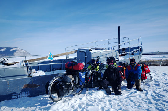 From Port Baikal on towards Kultuk we suddenly again were fighting with deep snow conditions and strong headwinds. It seemed, the lake would not allow us to finish. However, then at midday on March 2nd we reached Kultuk after 27 days of cycling and covering a distance of 1075 kilometers on the ice of Lake Baikal. Temperatures in the beginning were around minus 40 degrees at night and minus 20 during the day. As we headed towards the south end of Lake Baikal, temperatures increased to minus 5 degrees during day. It seemed that spring time was coming with the beginning of March. Soon we were sweating in our warm winter clothing, the winter boots seemed too warm and we took off a layer of gloves.