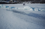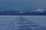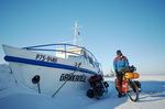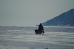 After stocking up with food and fuel in Ust Bargusin we again crossed the lake towards Olchon Island. For this distance of about 150 kilometers we needed a bit more than two days on very good ice conditions. Only three major cracks stopped our riding speed, but it was easy to push the bikes over. Cracks appear and move and one never knows how far away from the tent new cracks will open during the night. As we approached Olchon Island, two fishermen approached us with their car, asking where we were cycling from. They almost did not believe we were cycling over from Ust Bargusin. We were again judged with similarly astonishing looks as we entered the guest house in Chushir, where we again stocked up on food and fuel.