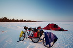 Our daily mileage varied from 25 kilometers to 55 kilometers depending on ice and snow conditions. Best cycling conditions we found south of Ust Bargusin and near Olchon Island, where there was almost no snow cover on the lake and we were able to cycle on blank ice in any direction. For that, our bikes were equipped with studded tires, which gave us good grip even on blank ice surfaces. These days with riding on the blank ice were pure joy and gave us a great feeling of freedom.