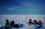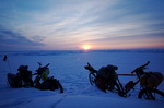 In general, our diet was very good and diverse. We started the day with a big portion of cereals cooked up with milk powder and dried fruit. In the morning we melted ice to fill our two large thermos bottles which would supply us with hot water and tea during the day. After every two hours cycling we had a small break in which we had some energy drinks, energy bars, a selection of nuts or some ham. Of course we had to thaw our food in our pockets in advance, as everything was frozen hard at temperatures way below that of a home freezer. The main task during the evening then was to again melt enough ice to cook a dinner meal of rice, pasta, mashed potatoes, buckwheat or couscous enriched with dehydrated vegetables and meat. A bar of chocolate serve as dessert, and tea or hot chocolate was for drinking.
