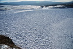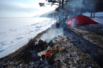 Another challenge we faced each day was the task of finding a suitable spot for pitching our tent at night. Our first night on the lake was rather unpleasant as we were constantly wakened by the cracking and snapping sounds of the ice beneath us. Sometimes it reminded us of thunders and earthquakes which moved through the ice below us. Although the lake is frozen with a thick layer of ice, some sections of the ice are in constant movement. Especially during low night temperatures, cracks appear and move and one never knows how far away from the tent new cracks will open. So we quickly learned where to find "quiet" zones on the ice or we simply pitched our tent on the shore of the lake. A good night's rest was vital for us, as we were active basically from sunrise to sunset every day.