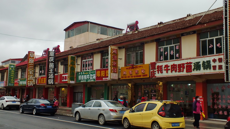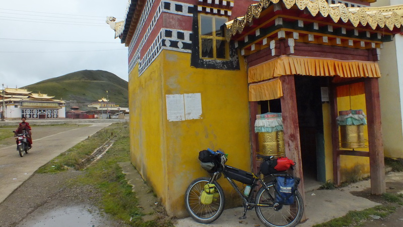 Die Reise beginnt mit einer 10-stündigen Busfahrt von Chengdu nach Ruo‘ErGai (Zoige), wo meine kleine Radtour beginnen soll. Es geht von 520 m Höhe auf 3400 m. Das Radel hat die Bushfahrt gut überlebt und hat auch nichts gekostet. Das Vorderrad musste ich ausbauen, dann hat alles gut in das Gepäckfach im Bus gepasst. Am Nachmittag beginnt es dann zu regnen und so mache ich den kurzen Spaziergang durch das Städtchen bei Nieselregen. Die Häuser sind im traditionellen Baustil mit verzierten Fensterramen, es gibt viele Restaurants und kleine Läden.