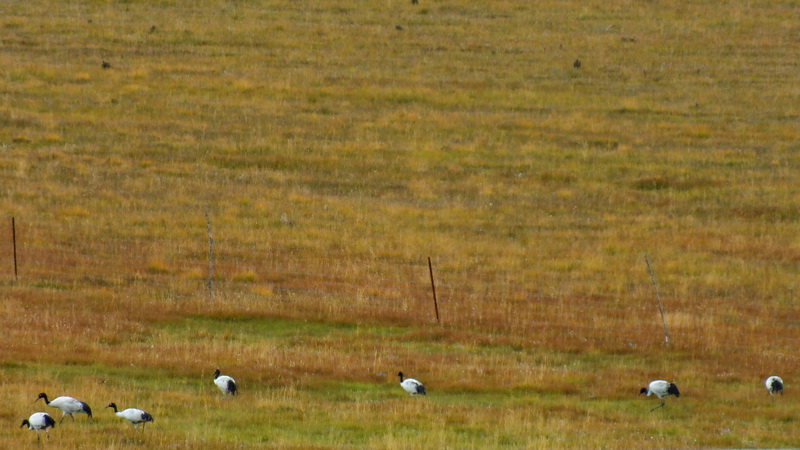 Am frühen Nachmittag erreiche ich das Städtchen TangKe, am „Weißen Fluss“ gelegen, ein Nebenfluss des Gelben Flusses. Der "Weiße Fluss" ist träge, langsam fließend, stark mäandrierend. Nur wenige Kilometer entfernt mündet er in den Gelben Fluss, den Huang He. Ich brauche nichts, also fahre ich einfach durch und genieße wenig späte wieder das weite Grasland. Auf den Wiesen am Fluss sehe ich sogar einige Kraniche.