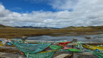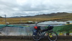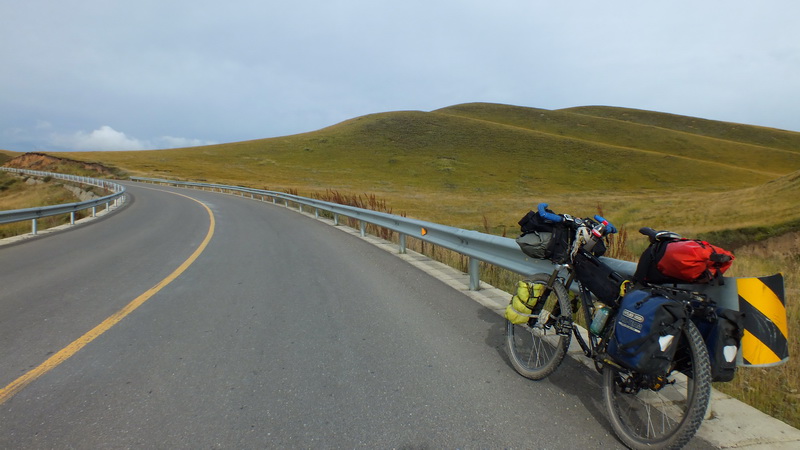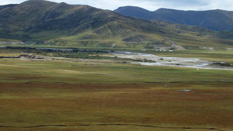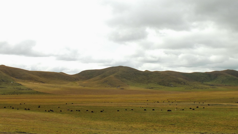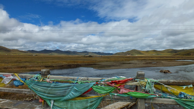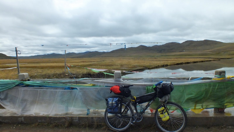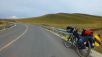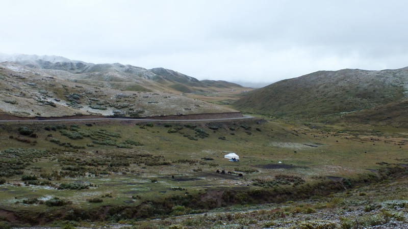Am nächsten Morgen geht es los: Zur Akklimatisierung zum Glück eher flach, also zwischen 3400 m und 3800 m durch das tibetische Grasland. Der Himmel ist bewölkt, aber es regnet nicht. Sehr schön, denn Regen beim Radeln mag ich gar nicht. Erinnerungen an die Mongolei-Tour 1996 werden wach, das weite hügelige Grasland, die Nomadenzelte, die Tiere. Nur eins ist neu: Zäune. Zu meiner Enttäschung sind große Bereiche des Graslandes eingezäunt. Nun, auch das ist in vielen anderen von mir bereisten Ländern ähnlich, Namibia, Patagonien, Australien, USA… Dennoch fühle ich mich irgendwie ausgesperrt. Zum Trost ist die Straße neu geteert, lässt sich super fahren, und ich habe auch kaum Probleme mit der Höhe. Lediglich an den Steigungen bin ich entsprechend langsam.