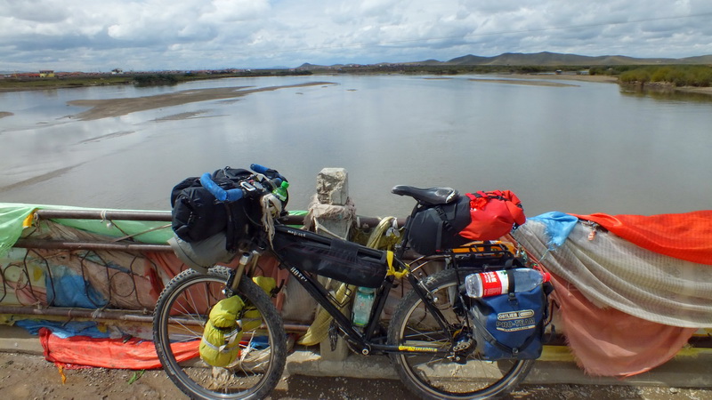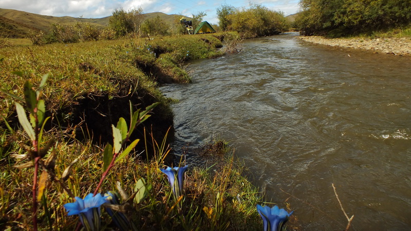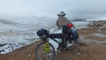 Am nächsten Morgen, nur schlecht ausgeruht, erwartet mich gleich früh ein Anstieg von etwa 200 Höhenmetern. Was normalerweise kein Thema wäre, ist jetzt, nur so leidlich an die Höhe angepasst, eine Sache von einer Stunde, inclusive einer kurzen Schiebepassage. Der nächtliche Schnee war an meinem Zeltplatz morgens schon wieder getaut, aber hier auf 3800 m ist die Landschaft noch weiß. Ich bleibe nicht lange, ziehe nur eine winddichte Jacke über und mache mich an die Abfahrt. Kurze Zeit später ist die Landschaft wieder grün, und ich sehe auch wieder Kraniche am Fluss, sowie die Enziane und Edelweiß.