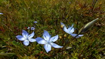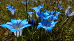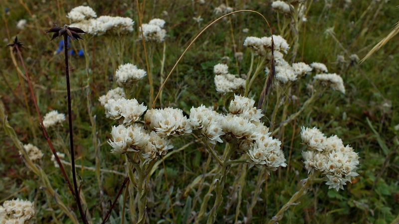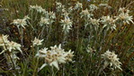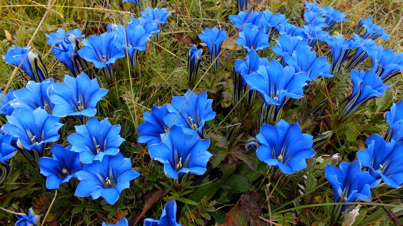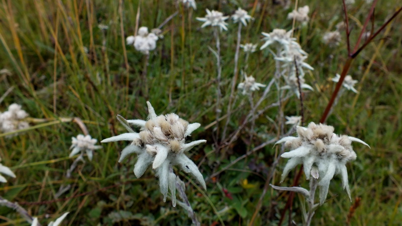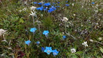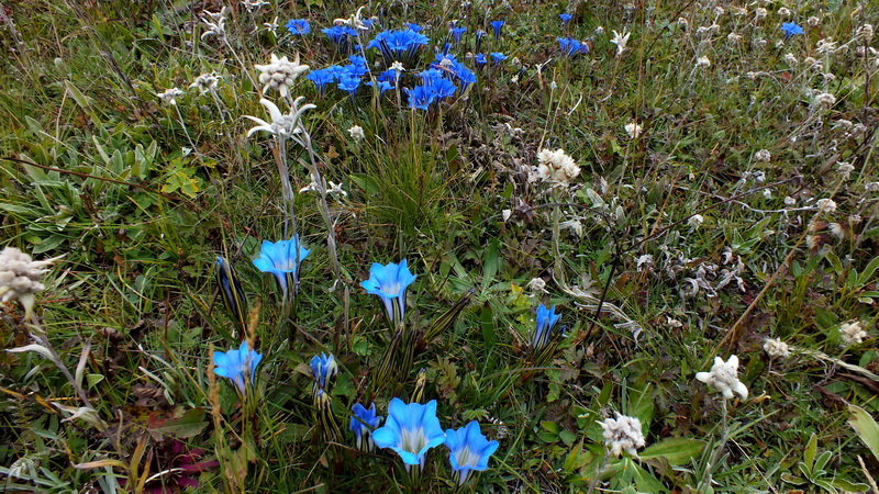 Auf einmal sehe ich in der Wiese hellblaue Punkte leuchten: Enziane! Daneben ganze Rasen mit Edelweiß! Und dazu noch einige andere Blumen. So schöne Blumenwiesen hätte ich jetzt Ende September gar nicht mehr erwartet. Am späteren Nachmittag baue ich mein Zelt dann in genau so einer Enzian-Edelweiß Wiese auf.