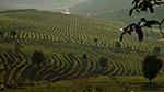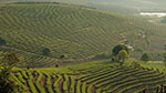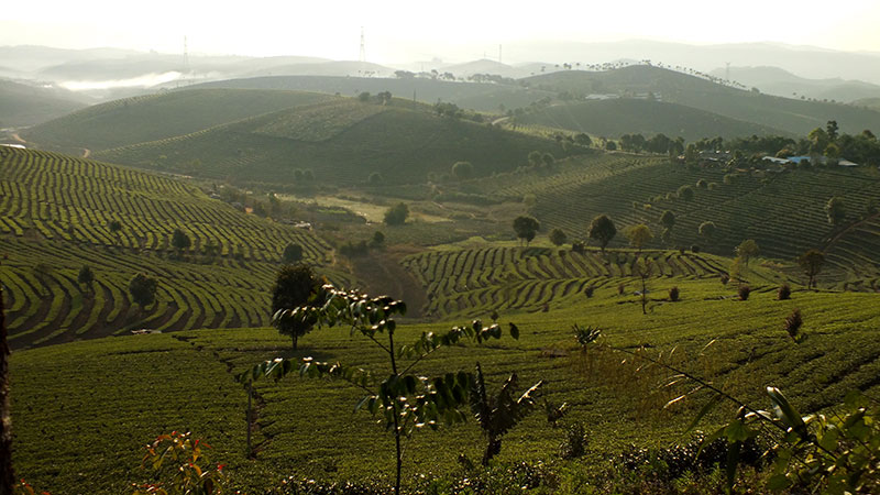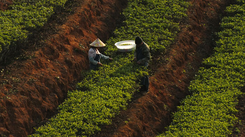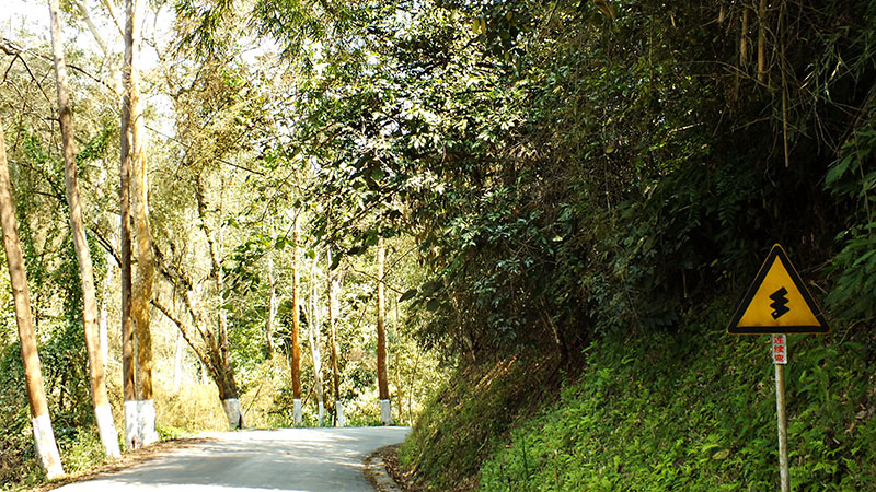 Der nächste Morgen bringt eine wunderschöne Fahrt, meist kurvig bergauf bergab durch Wald mit sich immer wieder bietenden Aussichten auf die Teeplantagen. Während ich im schattigen Wald radle, blicke ich auf eine Landschaft, die eindrucksvoll vom Menschen gestaltet ist. Terrassenartig sind die Berge bis zum Horizont mit Teebüschen überzogen. Das frische Grün der neu ausgetriebenen Teeblätter leuchtet in der Sonne, hier und da wird auch schon fleißig geerntet. Vereinzelt sehe ich sogar auch Plantagen, in denen Teebäume wachsen, eben jene ursprünglich aus diesen „Teebergen“ Südyunnans stammenden Bäume (Qingmao, Camellia sinensis), aus dessen Blättern seit etwa 1700 Jahren der sogenannte Pu’er Tee gemacht wird.