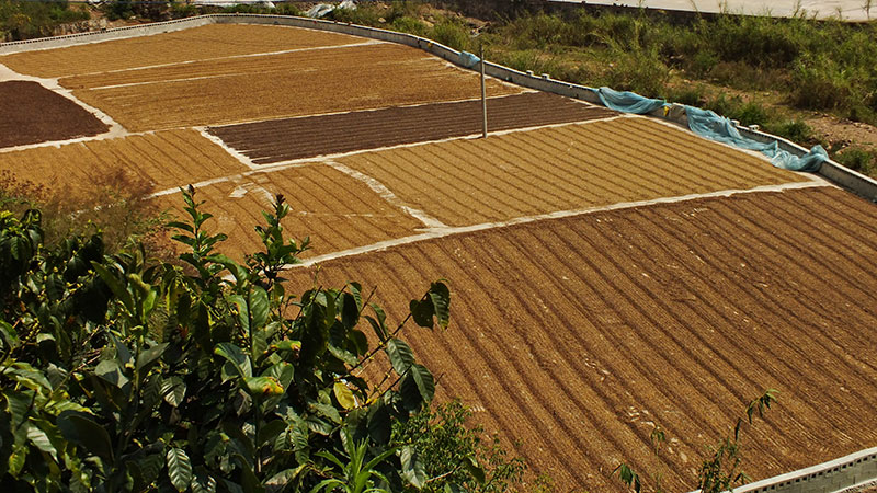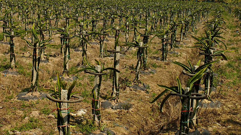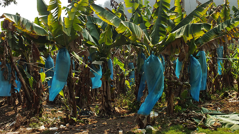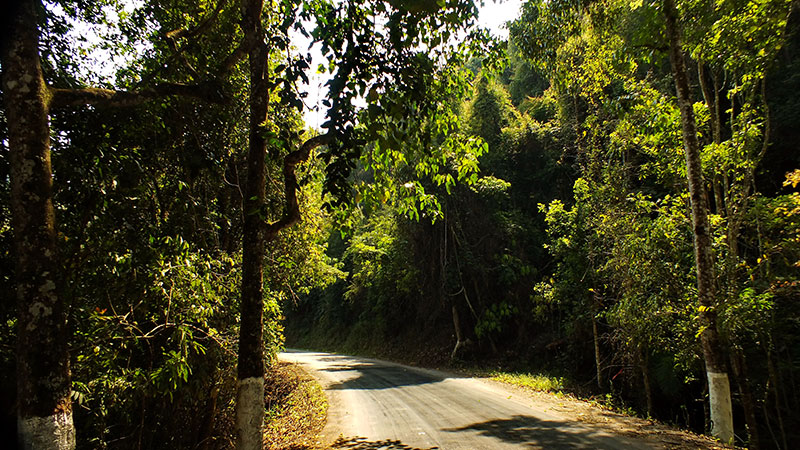 Gegen Mittag verlässt die Straße den schattigen Wald und führt nun für mehrere Kilometer in einem breiten Tal. Hier wird alles Mögliche angebaut: Kautschuk, Bananen, Kaffee, Drachenfrucht. Allerdings nicht immer schön, und nachhaltig wohl auch nicht. Vor allem die Bananenplantagen sind extrem intensiv, auch was den Gifteinsatz anbelangt. Aber wie es leider nun mal so ist: Angebaut wird, was Geld bringt. Und momentan bringen Bananen wohl Geld, so dass viele Reisfelder in Bananenplantagen umgewandelt wurden. Kautschuk war vor einigen Jahren stark angesagt, jetzt ist der Kautschukpreis aber so stark gesunken, dass sich teilweise der Betrieb der Kautschukplantagen nicht mehr lohnt.