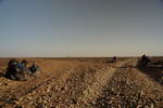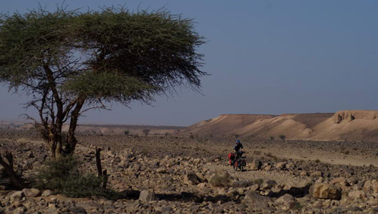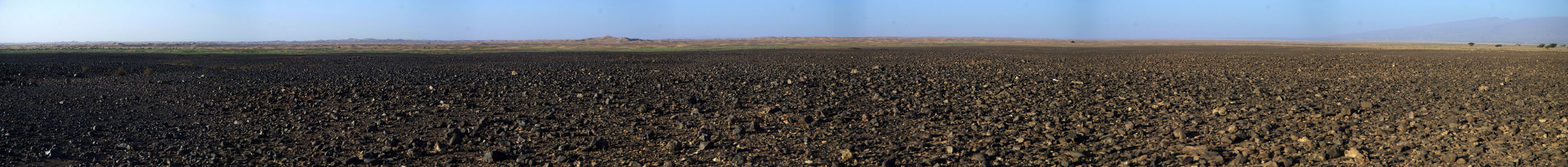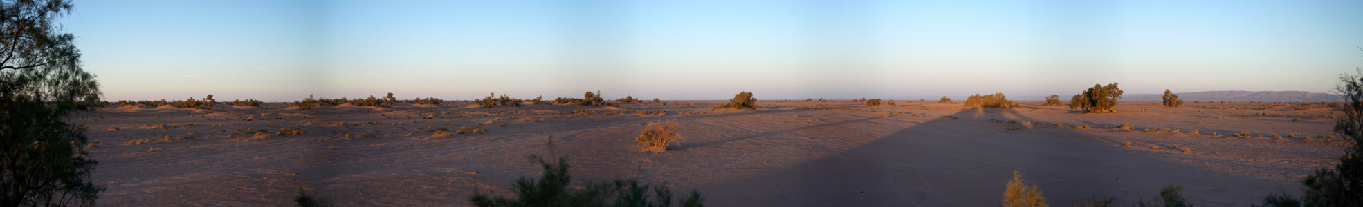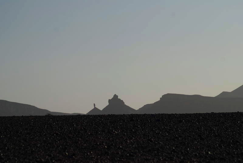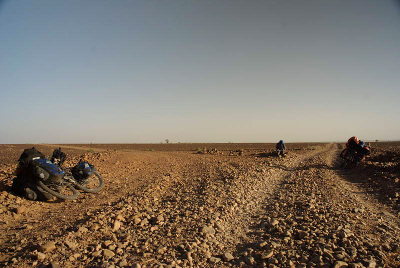 Über eine trockene Lehmpfanne eines Ausläufers des Lac Iriki können wir endlich wieder etwas Geschwindigkeit aufnehmen und erreichen das Dorf Zaouia-Sidi-Abd-en-Nebi. Dort holen wir Wasser für den Abend und radeln am Rad des Berglandes weiter. Die Piste ist jetzt nicht mehr ganz so grobsteinig, so daß wir ganz passabel vorankommen. Etwas später (ca. 10 km nach dem Dorf) ist eine Ansiedlung von Nomaden. Omar, der Lehrer der Nomadenschule lädt uns in sein Zelt ein, es gibt eine große Portion Kuskus mit Gemüse. Omar spricht ganz gut Englisch, so daß wir uns unterhalten können. Wir bleiben dort über Nacht und schlafen in einem unbenutzten Nomadenzelt.