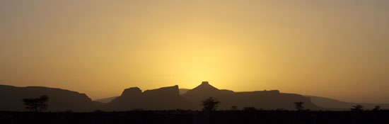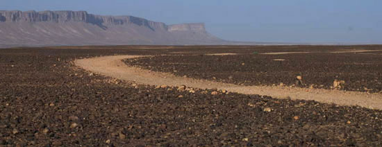 Am frühen Nachmittag Einstieg in die Piste nach Osten. Es ist warm, viel zu warm für uns! Als wir außer Sichtweite der Straße sind ist erstmal "ausziehen" angesagt. Die warmen Klamotten verschwinden jetzt nach unten in den Packtaschen. Die Piste beginnt sehr steinig, nur holpriges, langsames Fahren ist möglich. Dennoch freuen wir uns, jetzt hier in der Wüste die Ruhe genießen zu können und mit der Piste allein zu sein. Steinwüste rechts und links, unterbrochen nur durch einzelne Akazien und in der Ferne blicken wir auf hohe Tafelberge. Es macht Spaß hier zu sein! Besonders faszinierend finde ich es, wie die Piste angelegt ist: Noch zu Zeiten des französischen Protektorats hat man hat in regelmäßigen Abständen Steinmännchen beiderseits der Piste gebaut und teilweise die Piste durch eine Steinlinie abgegrenzt. Ich möchte nicht wissen, wie viele Menschen unter welchen Bedingungen beim Bau solcher Pisten eingesetzt und verschlissen wurden... Wir Übernachten in der Steinwüste mit Blick auf Tafelberge im Südwesten. Der Mond erscheint als ganz dünne Sichel und wandert vor der hellen Venus im Sudwesten dem Horizont zu. Es ist ein lauwarmer Abend, wir kochen und essen (wie meistens auf dieser Reise) im Freien.