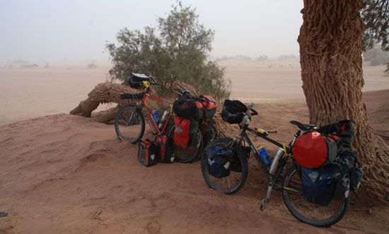 Im frühen Morgenlicht radeln wir weiter nach Osten, die Piste ist jetzt gut zu fahren, wenn auch das Terrain am Rand des Gebirges etwas welliger ist als noch am Vortag. Der Wind, der in den letzten Tagen immer erst ab Mittag spürbar wurde, schiebt uns schon ab 10 Uhr morgens, so dass wir sicher sind, M'Hamid bereits am Abend zu erreichen. Dennoch tanken wir an der heiligen Quelle Abd-er-Rahmane nocheinmal genug Wasser, um auch übernachten zu können. Als wir auf der Piste vom Gebirge weg weiter nach Südosten fahren, bemerken wir, dass der Wind schon zum Sturm angewachsen ist, den wir jetzt schräg von der Seite haben. Wir fahren weiter, und sind optimistisch, abends in M'Hamid zu sein. Als wir das Qued Draa erreichen, weht der Sand schon ganz kräftig über den Boden. Die alten, knorzigen Tamarisken sind im Dunst kaum zu erkennen. Ich finde es extrem schade, hier jetzt einfach so durchzufahren. Nach kurzer Beratung ist die Strategie klar: M'Hamid kann uns mal, wir wollen in dieser tollen Landschaft bleiben und hoffen, dass wir morgen früh bei windstille Gelegenheit haben, die alten Tamarisken anzuschauen, und auch die Dünen besser zu sehen. Wir suchen uns also ein möglichst dichtes Tamariskengebüsch, wo es einigermaßen windstill ist. Wir finden einen geeigneten Platz und genießen unser Abendessen mit Blick auf die treibenden Sandschwaden im Qued Draa. Nachts legt sich der Wind.