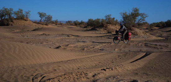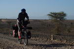 Wir lassen uns Zeit beim Abbau des Lagers und freuen uns, daß wir entschieden hatten, hier zu nächtigen. Die knorzigen Tamarisken sind tolle Fotobjeke, jeder der alten Bäume steht wie eine Insel in einer Sanddüne. Auf den lehmigen Abschnitten dazwischen kann man sehr gut radeln. Die letzten 5 km bis M'Hamid sind dann aber nocheinmal sehr sandig, und als wir mehr und mehr schieben müssen, sind wir verdammt froh, dass wir hier nicht während des gestrigen Sandsturms lang mussten.