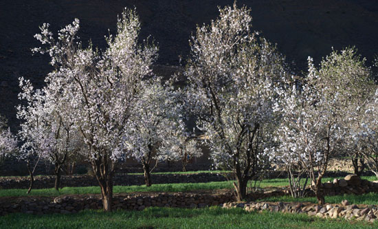 Wir entschließen uns dann für die Piste über den Jebel Saghro. Tatsächlich scheint der Wind gegen Nachmittag etwas abzuflauen. Wir fahren also am frühen Nachmittag in die Piste ein, machen an einer windgeschützten Stelle erst noch einmal eine Mittagspause mit dem frisch gekauften Baguette. Wir schaffen dann noch ca. 25 km, die ersten 10 km allerdings sehr windexponiert. Dabei haben wir das ein oder andere mal das Gefühl, regelrecht von der Piste geweht zu werden. Die Piste führt zunächst durch Steinwüste über einen Bergrücken (welliges Terrain), dann gibt es eine kurze, steile Abfahrt in eine enge Schlucht, der die Piste langsam bergauf folgt. In der Schlucht sind zahlreiche Dörfer und Palmen/Mandelbaumplantagen. Es ist nahezu windstill und wie in einer idyllischen, anderen Welt. Wir Übernachten auf einer Schotterfläche neben Feldern mit blühenden Mandelbäumen.