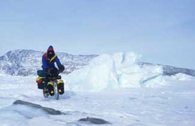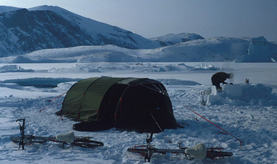 | Wer langsam fährt, macht weniger Fehler und spart Energie, die wir in Form von Kcal mitschleppen mußten.Unser Speiseplan enthielt 5,5 Mcal für jeden pro Tag. Das bedeutete 1,2 kg pro Person und Tag. Da wir maximal für 3 Wochen Proviant mitschleppen konnten, legten wir Depots an. Ausrüstung und Proviant hatten wir im Herbst per Schiff vorgeschickt. In Upernavik und in Uummannaq lagerten dann unsere Kisten, wo wir vor jeder Tour neuen Proviant und Kerosin tanken und den Müll der vorhergehenden Tour ausluden. Wie man eine so hohe Kalorienmenge futtern kann, hat schon viele fasziniert. Aber dahinter steckte viel Arbeit. Die beste Müslimischung mußte erst gefunden werden, die Müsliriegel gebacken, das Studentenfutter fertig sein und der riesige Proviantplan stehen, ehe wir uns nach Norden aufmachen konnten. Doch nicht nur das Radfahren machten einen erhöhten Kalorienbedarf notwendig, vorallem die tiefen Temperaturen forderten einen Tribut von zusätzlichen 2 Mcal. | |