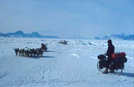 Gottfried Debove. Im Februar 1992 starteten wir in Upernavik / Nordwestgrönland und fuhren entlang der Küste von einer Ortschaft zur nächsten. Die Temperaturen sind so niedrig, daß ein Inuit sich hütet, allzu anstrengende und schweißtreibende Arbeiten zu verrichten. Grund ist seine schwere Fellbekleidung, die nicht atmungsaktiv ist. Auch für unsere Expedition war der grönländische Winter eine große Herausforderung für die Bekleidung. Fuhren wir zu schnell, so schwitzten wir entsprechend. Wasserdampf bedeutet jedoch Gefahr. |