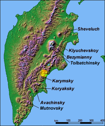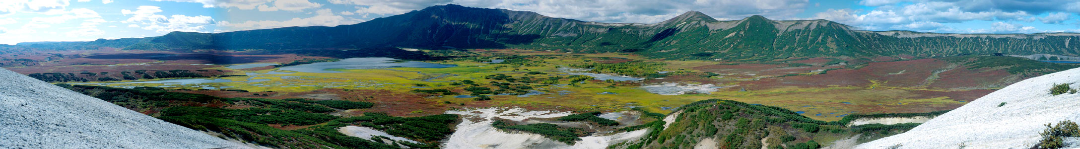 westliche Richtung in Richtung Kronozky Zapovednik. Nach drei Tagen Wanderung durch Hochstauden und Birkenwald (Betula ermanni) stiegen wir auf ein höher gelegenes Tundraplateau auf. Von nun an hatten wir Freie weite Sicht auf die Vulkane Maly Semiachik, Karymsky, Kronozky. Für die Wanderstrecke innerhalb des Kronozky Zapovednik mussten wir in Begleitung eines Nationalpark Rangers sein. Treffpunkt war die Hütte Sini Dol am Rande des Parks. Der Ranger begleitete uns bis zur Uzon Caldera und zum Tal der Geysire. |