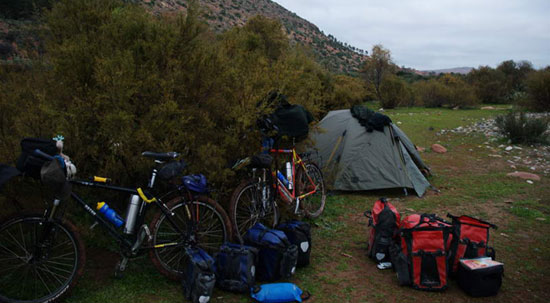 Flug ab Frankfurt Hahn, Schneegestöber beim Abflug. Mit einer Stunde Verspätung landen wir in Marrakesch. Es ist bewölkt, regnet aber nicht. Wir trödeln in die Stadt, wollen einkaufen. Irren ein wenig in der Neustadt umher, bis wir einen Lebensmittelladen finden und ein paar Lebensmittel einkaufen, und holen noch etwas Geld an einem Automaten. Geraten dann fälschlicherweise auf die N8 nach Westen aus der Stadt, was aber sein Gutes hat, da wir dabei am Stadtrand noch einen riesigen Metro-Supermarkt entdecken und dort noch einige fehlende Dinge einkaufen. Mittlererweile ist es schon früher Nachmittag, als wir endlich auf der N9 in Richtung Ait Ourir radeln. Mit 17°C ist es uns enstschieden zu warm und der viele Verkehr und die doch eher trostlos aussehende Landschaft begeistert uns noch nicht wirklich. In Ait Ourir trinken wir erstmal eine Cola und holen bei der Gelegenheit auch ein bischen Wasser für den Abend. Langsam entspannen wir uns und beschließen hinter dem Dorf irgendwo einen Zeltplatz zu suchen. Es ist nicht einfach, aber schließlich finden wir einen geeigneten Seitenweg, der uns ans Ufer des Qued Rdat bringt, wo wir zwischen den Tamariskenbüschen zelten.