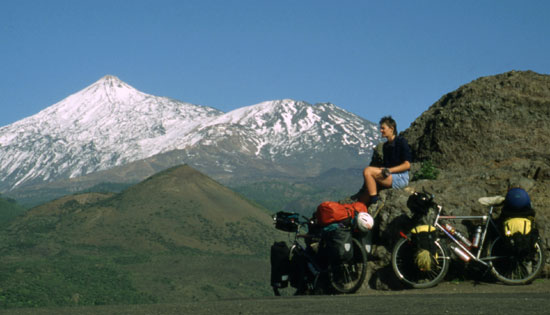 At least in March, with the peak of Teide still being covered in snow, riding further on smaller roads was not advisory. Therefore we camped in the Caldera for a few days and climbed the Teide by foot... On the day of our climb the weather was stormy and on the summit we had ice-rain and strong winds. It was fun after all (anyone can climb in good weather...). Due to the storm we spent one day in the tent waiting for better conditions to continue cycling. From Teide we had a beautiful descent to the northern coast!! We decided to not only use the paved main-road, but also some smaller gravel roads through the Pinus canariensis forest. We then found a very nice camping site near the lighthouse at the north-west point of the island. From there we continued our tour through the Teno Mountains. The vegetation was beautiful, with many flowering Euphorbia-species, but the roads were extremely steep, especially when riding with full equipment. After a short visit to Masca and the gorge, we continued back down to the south-western coast. There we took the coastal road passing a lot of tea and vegetable plantations. The last days of the tour we spent at the southern point of the island, near the lighthouse and at Punta Roca, relaxing at the beach.